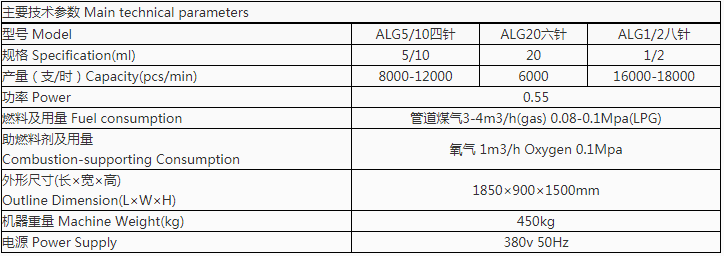 本机为8工位步进式传动系统,每次以8瓶为一组,分别送到各个工序点上,完成送瓶前充氮、灌药,后充氮、预热、拉丝封口等工序。